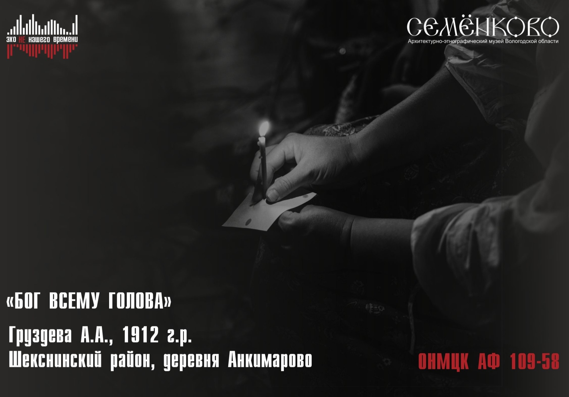 Проект «Эхо не нашего времени» стремится создать в музее под открытым небом среду, способствующую эмоциональному погружению и размышлениям о значимости традиционных ценностей и представлений для современного общества. Основу звукового ландшафта создадут оригиналы записей этнографических экспедиций, репортажи на различные темы, в том числе рассказы, былички, диалоги, фольклор, реконструкции записей Этнографического бюро князя Тенишева о вологодской деревне к. XIX – н. XX века; звуки природы и «живой деревни» с привязкой к конкретным локациям музея, оправданным с точки зрения тематики. Будут созданы условия, при которых человек самостоятельно исследует крестьянские представления об окружающем мире, крестьянском ладе, формирует собственный взгляд и отношение, участвует в обсуждении злободневных современных вопросов.